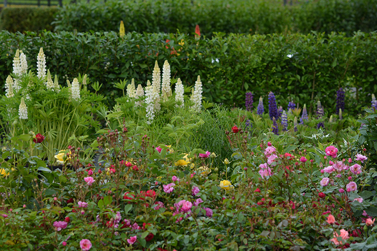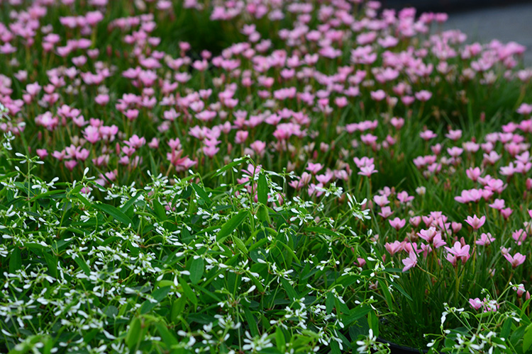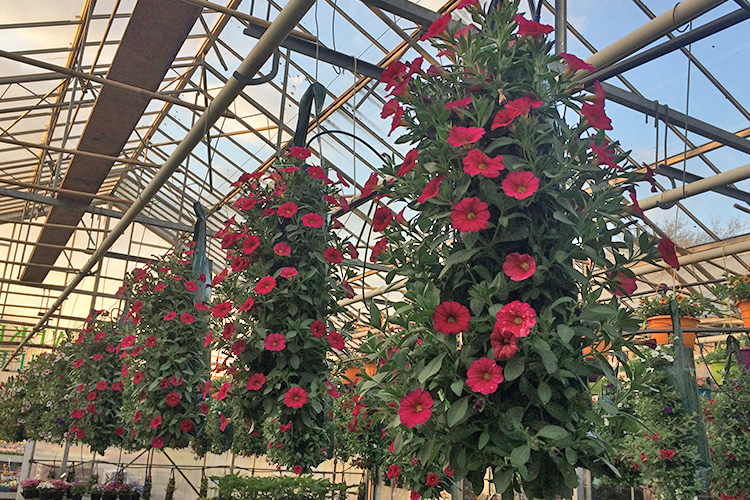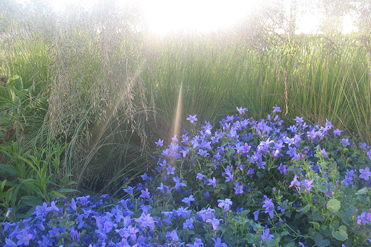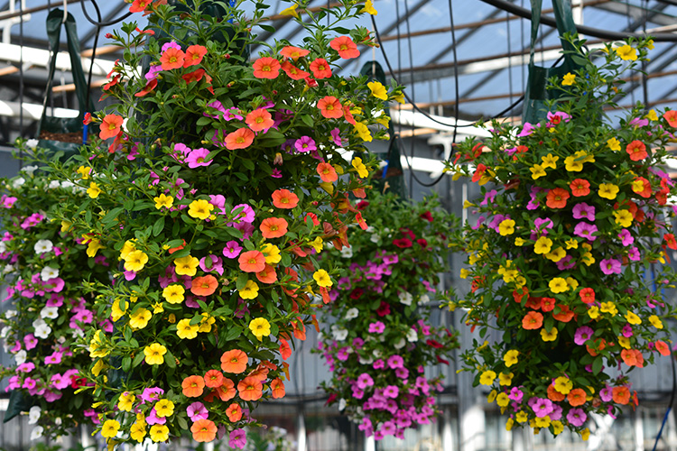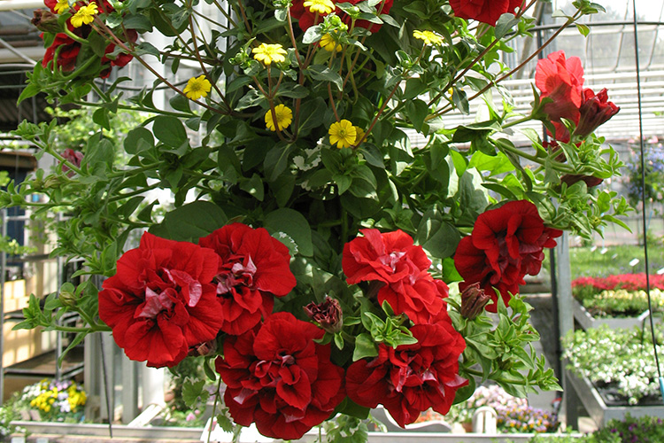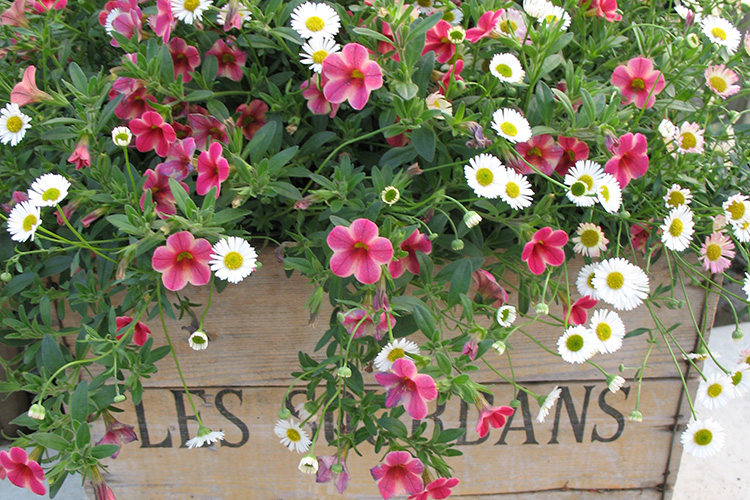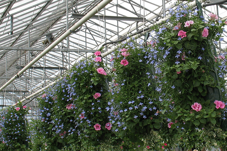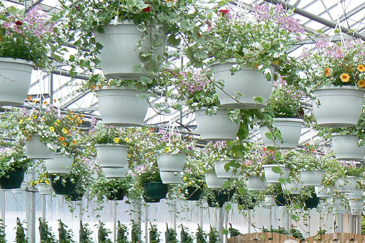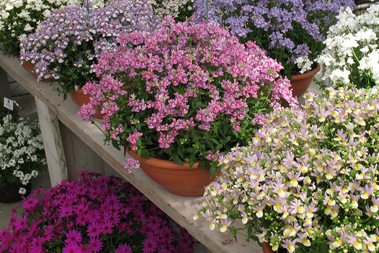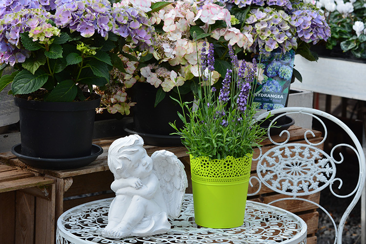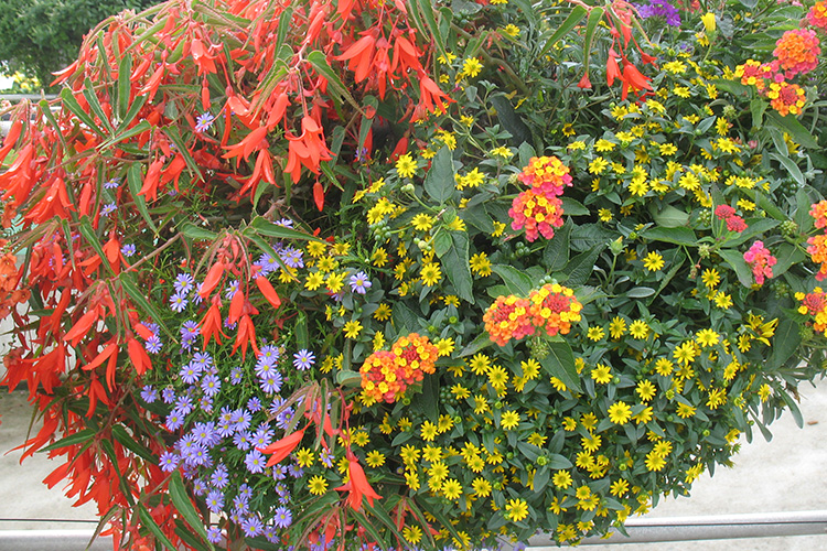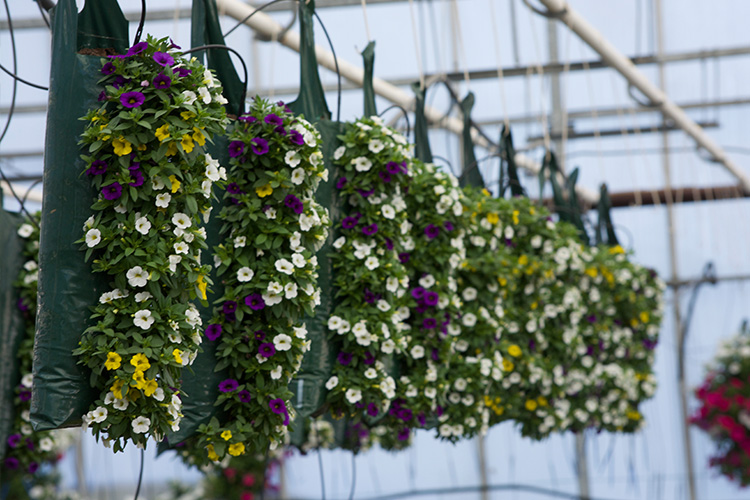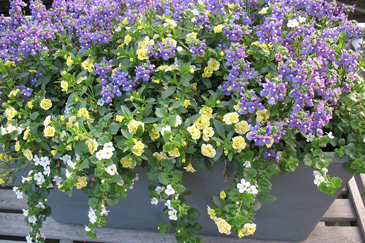 groenblijvende bodembedekkers, siergrassen bloemenhangzakken met viooltjes of zomerbloeiers,