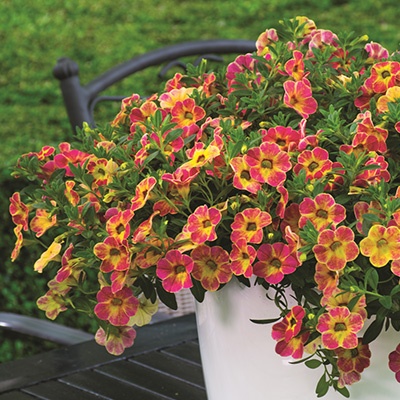 De Calibrachoa Chameleon Sunshine Berry produceert werkelijk een massa rood met gele bloemen. Het is een trendy topper om je terras of balkon te sieren met een zee van rood met gele kleine petunia-achtige bloemen.