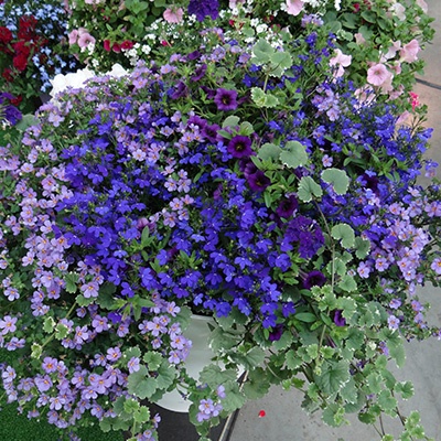 Breng wat leven aan een pergola, garage, balkon of terras met onze vrolijke hangpotten. In dit voorbeeld werden in de pot bloeiende Lobelia, Bacopa, Calibrachoa en Glechoma opgekweekt. Onze trendy hangpotten in vrolijke kleuren worden opgemaakt met tientallen verschillende bloemencombinaties met o.a. Surfinia®, bloeiende hangplanten mix, MillionBells, Lobelia, Verbena, Delosperma, Begonia etc.