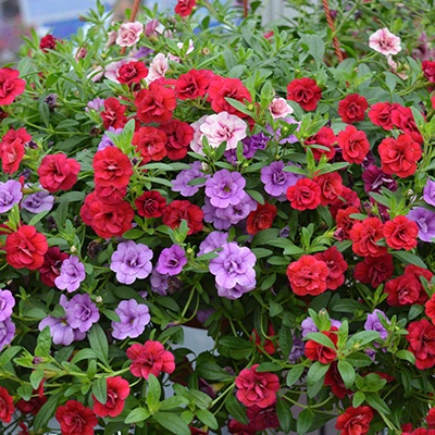 Beperkt in tuin? Creëer een bloemenparadijs met onze rode, blauwe en roze Calibrachoa in hangpotten.