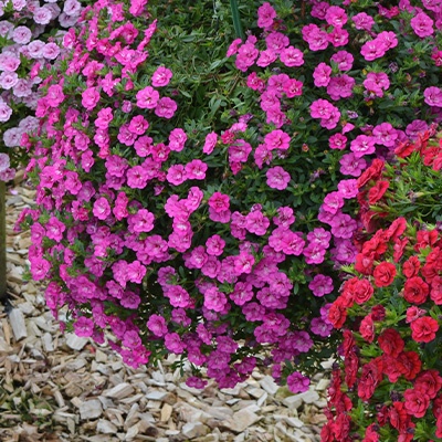 Beperkt in tuin? Creëer een bloemenparadijs met onze donkeroze dubbele Calibrachoa in hangpotten.