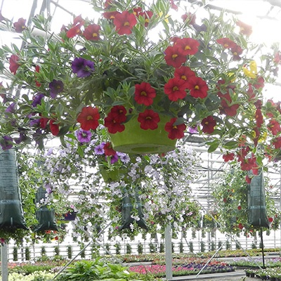 Breng wat leven aan een pergola, garage, balkon of terras met onze vrolijke hangpotten. In dit voorbeeld werden in de pot Calibrachoa Cabaret® opgekweekt. Onze trendy hangpotten in vrolijke kleuren worden opgemaakt met tientallen verschillende bloemencombinaties met o.a. Surfinia®, Calibrachoa, MillionBells, Lobelia, Verbena, Delosperma, Begonia etc.