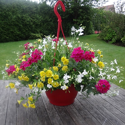 Breng wat leven aan een pergola, garage, balkon of terras met onze vrolijke hangpotten. In dit voorbeeld werden in de pot mix van hangplanten opgekweekt. Onze trendy hangpotten in vrolijke kleuren worden opgemaakt met tientallen verschillende bloemencombinaties met o.a. Surfinia®, Calibrachoa, MillionBells, Lobelia, Verbena, Delosperma, Begonia etc.