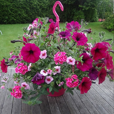 Breng wat leven aan een pergola, garage, balkon of terras met onze vrolijke hangpotten. In dit voorbeeld werden in de pot mix van roze tinten opgekweekt. Onze trendy hangpotten in vrolijke kleuren worden opgemaakt met tientallen verschillende bloemencombinaties met o.a. Surfinia®, Calibrachoa, MillionBells, Lobelia, Verbena, Delosperma, Begonia etc.