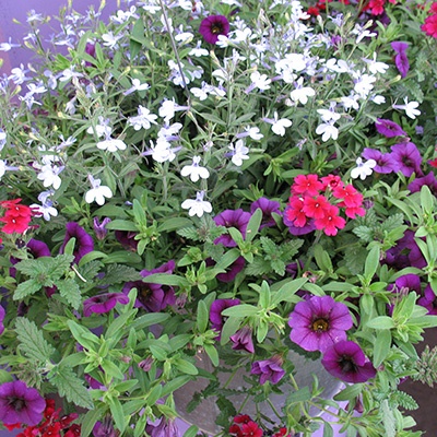 Beperkt in tuin? Creëer een bloemenparadijs met onze witte lobelia, blauwe Calibrachoa en roze Verbena in hangpotten.