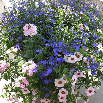 Beperkt in tuin? Creëer een bloemenparadijs met onze Calibrachoa, Lobelia en roze Verbena in hangpotten.