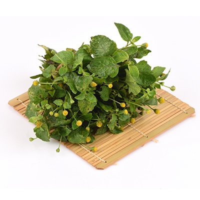 Acmella oleracea noemen we in het nederlands champagneblad of ABC-kruid. De plant is afkomstig uit tropisch klimaat en groeit bij ons als éénjarige. Champagneblad wordt 30 cm hoog, houdt van warmte en voldoende vocht op een plekje in zon of halfschaduw. Het is een rijk vertakte, breed uitgroeiende plant die kan fungeren als bodembedekker doordat op de grond hangende zijtakjes gaan wortelen. Deze plant doet het ook goed in een pot. Acmella oleracea heeft donkergroen, licht getand, hartvormig blad en bloeit van juni tot de eerste vorst. De bolvormige bloemen zijn geel met een roodbruine kern. Zowel blad als bloemen zijn eetbaar en hebben medicinale eigenschappen. De bloemen van champagneblad veroorzaken een prikkelend, licht verdovend gevoel in de mond en geven een pittige, waterkersachtige smaak in salades.