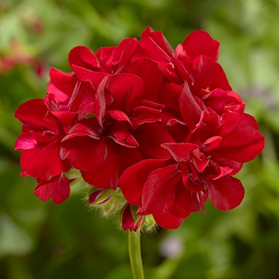 Pelargonium peltatum Corriente Dark Red, ook wel bekend als dubbele hanggeranium, is een zomerbloeier met ietwat broze stengels. Deze Pelargonium peltatum Corriente Dark Red dubbele hanggeranium bloeit van mei t/m oktober met donkerrode bloemen en hangt bij voorkeur in de zon of halfschaduw. Tegen de muur in een bloembak, of op het balkon misstaat een hanggeranium nooit. Bijen, hommels en vlinders vertoeven graag op deze bloemen.