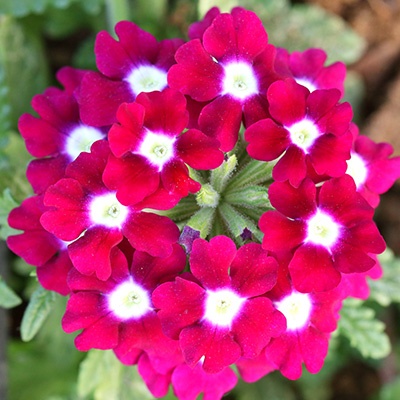Verbena x peruviana Samira® Up Cherry Eye is een rechtop groeiende Verbena die massa's levendige kersenrode bloemen met een wit oogje produceert boven zijn frisgroene bladeren. Ideaal voor hangmanden en potten.